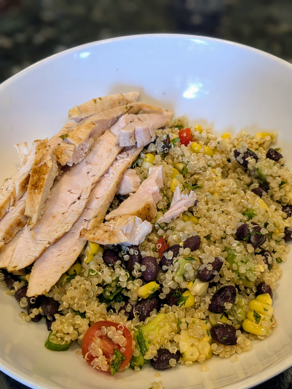 - To assemble the bowls, divide the quinoa among 4 serving bowls. Top with chopped romaine lettuce, corn salad and grilled chicken. Drizzle with the remaining dressing and garnish with fresh cilantro. BAM! YOU’RE DONE!😊